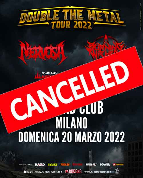 A causa delle attuali restrizioni dovute alla pandemia è annullato il Double The Metal Tour 2022 previsto per il prossimo 20 marzo 2022 al Legend Club di Milano. Si sarebbero esibite come headliner le NERVOSA, all-female thrash metal band brasiliana, le BURNING WITCHES, la heavy metal band svizzera tutta al femminile e in apertura la blackened death/doom metal band ucraina 1914, gli (0), progressive black metal danese e i Warfect con il loro thrash metal. Evento FB