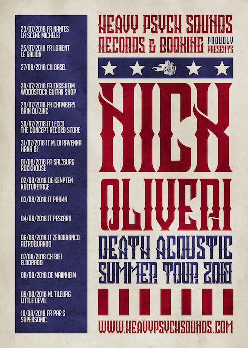 Supportato dalla Heavy Psych Sounds Records & Booking, Nick Oliveri ha comunicato le date anche se alcune sono in via di definizione, come le quattro italiane. Il musicista sarà in fatti il 30 luglio a Lecco, il giorno dopo a Marina di Ravenna, mentre per le date del 3 e 4 agosto a Parma e Pescara, c’è da definire i luoghi dell’esibizione.