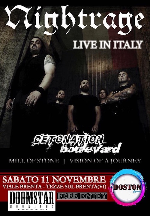 I Nightrage saranno supportati dai vicentini Detonation Boulevard che per l’occasione prepareranno uno special live, estendendo la formazione a 5 componenti, con l’ingresso del fantasista Marco Angelo come secondo chitarrista della Band.