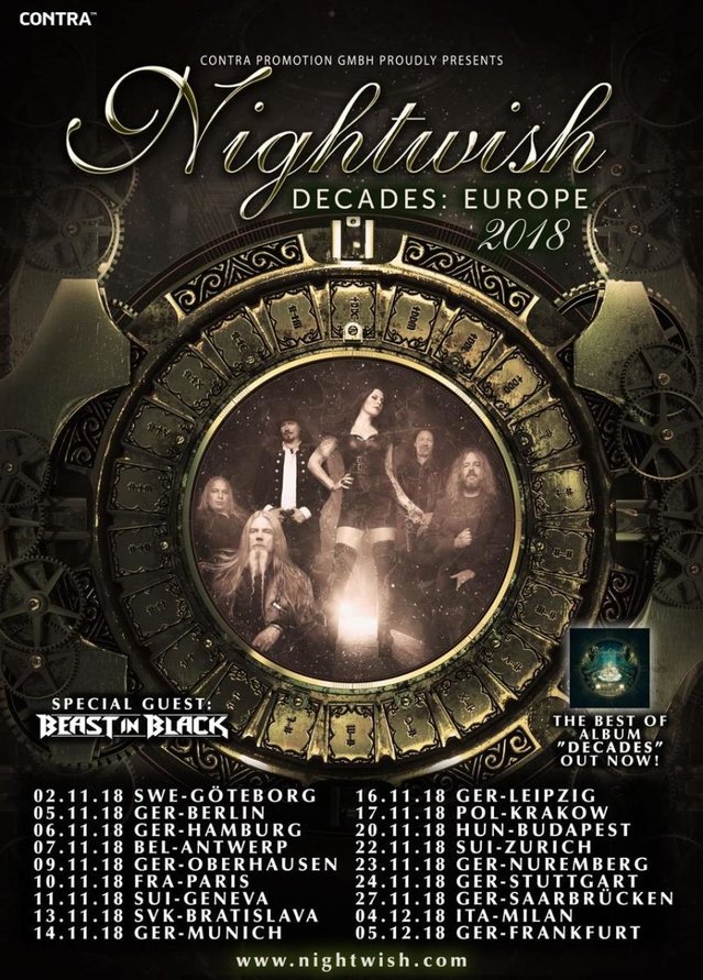 I dei finlandesi del symphonic metal NIGHTWISH hanno pubblicato la loro nuova raccolta best-of “Decades” il 9 marzo su Nuclear Blast per festeggiare più di vent’anni di carriera (recensione qui). Questo importante anniversario viene celebrato a dovere anche attraverso un tour mondiale. La band, attualmente in Nord America, arriverà in Europa a novembre e dicembre, e sarà accompagnata da un ospite d’eccezione: i BEAST IN BLACK (recensione ultimo album qui), guidati dall’ex chitarrista dei BATTLE BEAST Anton Kabanen.