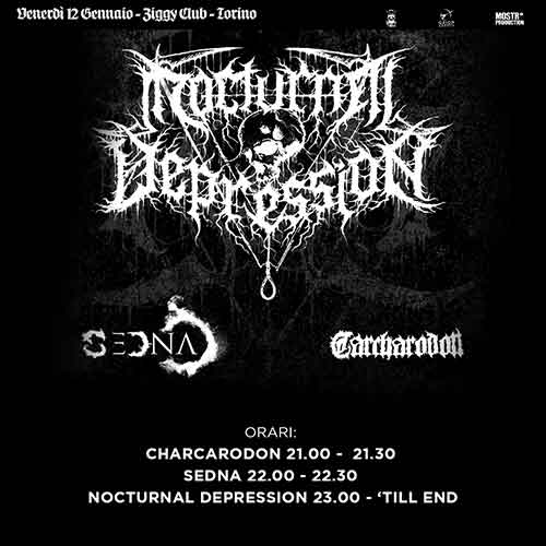 Questo venerdì, 12 gennaio, allo Ziggy Club di Torino si esibiranno i Nocturnal Depression con Sedna e Carcharodon. Mostro Production comunica gli orari dell’evento: