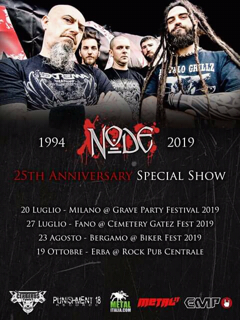 Per celebrare i 25 anni di attività, la band death metal milanese Node annuncia alcuni concerti i cui dettagli sono di seguito. I concerti vedranno una set-list speciale dedicata interamente alla loro storia, partendo dunque dall’dall’EP di esordio “Ask” fino a oggi, con una larga parentesi dedicata a “Das Kapital”, album pubblicato 15 anni fa.