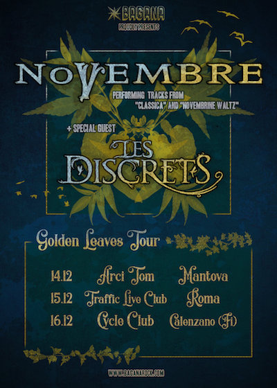 Tre date esclusive nella penisola per i NOVEMBRE, la gothic-doom metal band italiana senza paragoni. Carmelo Orlando e i suoi proporranno un set che ripercorrerà tutti i brani più acclamati, tratti dai capolavori “Classica” e “Novembrine Waltz”, riportando live le sonorità che li hanno da sempre contraddistinti.