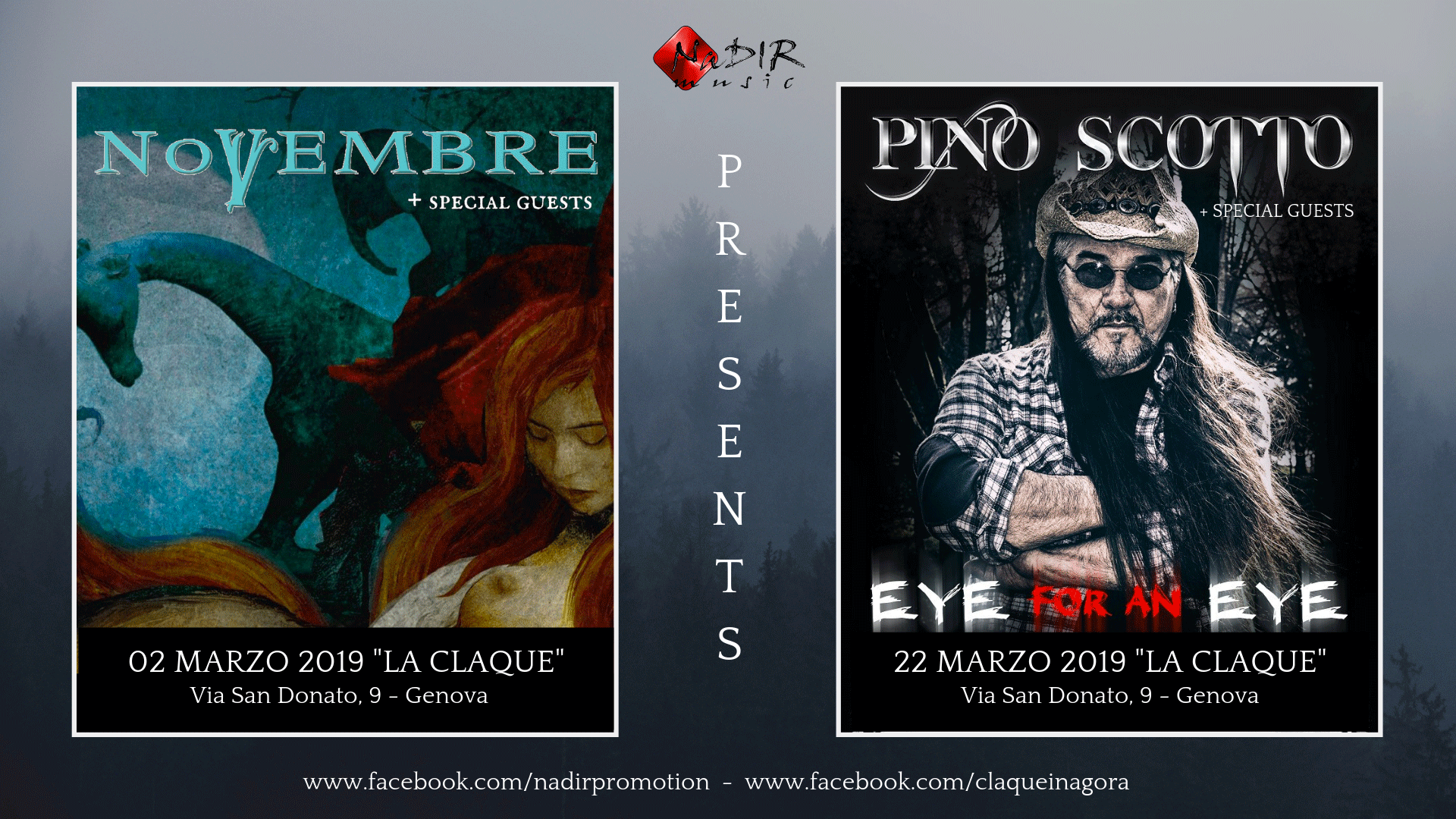 Sabato 2 Marzo i capitolini Novembre porteranno per la prima volta nel capoluogo ligure il loro metal atmosferico velato di sfumature doom e gotiche, mentre il 22 Marzo toccherà invece a Pino Scotto, alfiere dell’hard rock nazionale, tornare a scaldare i fan liguri con le sue sonorità sincere e sanguigne.