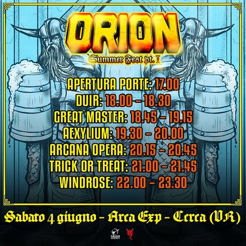 Ecco gli orari dell’Orion Summer Fest che si terrà Sabato 4 Giugno all’Area Exp di Cerea (VR):