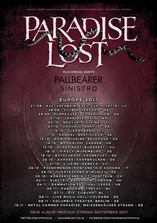 In attesa di dettagli sul nuovo album “Medusa”, i Paradise Lost annunciano già un tour europeo che si terrà questo autunno. Tra settembre e novembre la band passerà per 14 paesi diversi, per celebrare l’uscita del quindicesimo album il quale vedrà un ritorno alle radici doom con il growl di Nick Holmes.