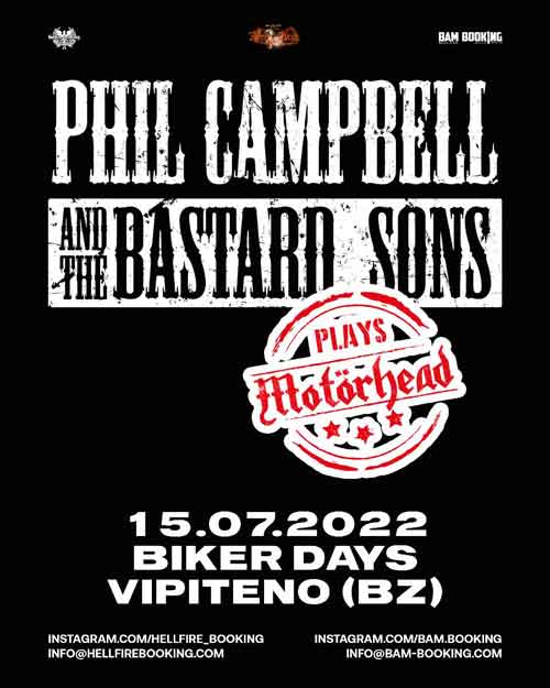 Per celebrare i 40 anni dei Mc Falken MC, organizzatori del Biker Days, la set-list del concerto di Phil Campbell, accompagnato dai suoi Bastard Sons, sarà dedicata proprio ai brani più celebri dell’indimenticabile band inglese, che hanno reso i Motörhead una delle icone indiscusse del Rock n’Roll mondiale.