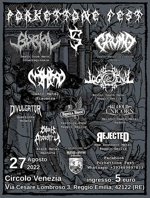 Insieme a loro ci saranno molti altri: i Benza Broi, trio hardcore punk da Reggio Emilia, i Bloody Unicorn, band melodic death metal da Padova, i Divulgator, che definiscono il loro stile come “Quarkcore”, i Black Ancestry, tenebrosa band black metal da Mantova, e i Rejected, che faranno il loro debutto al Porkettone presentando il loro stile new southern
