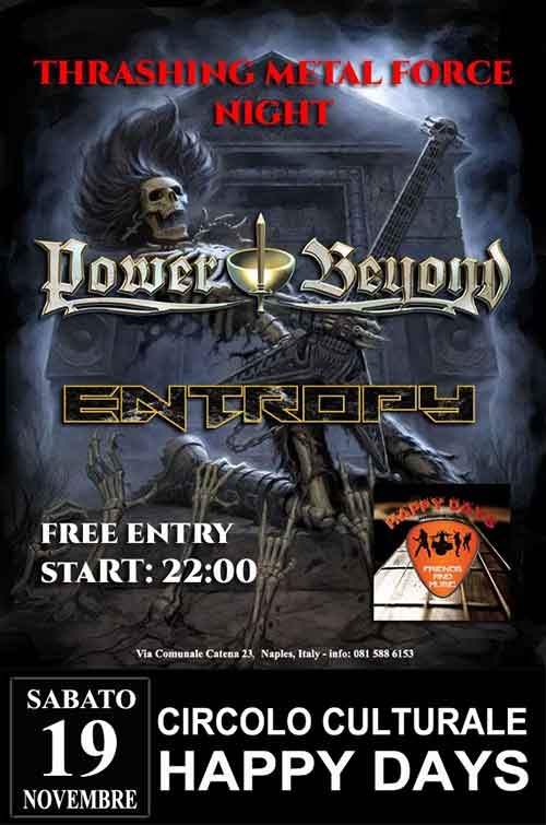 Sabato 19 novembre Power Beyond e Entropy terranno un concerto al Circolo Culturale Happy Days di Napoli, sito in via Comunale Catena 23.
