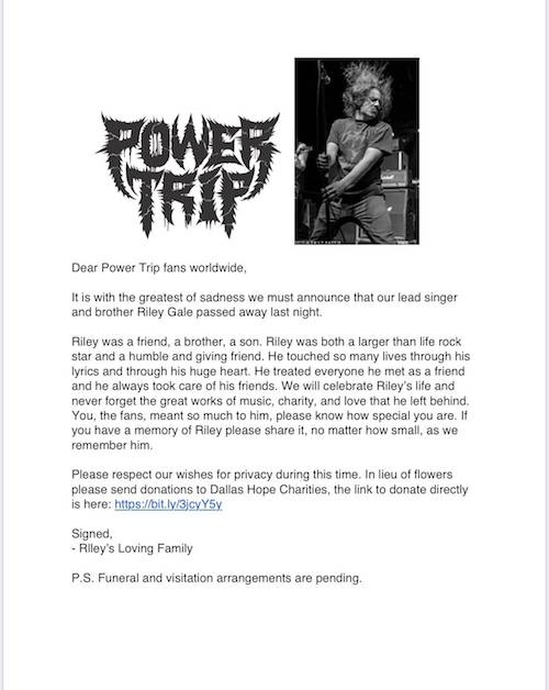 Il motivo della morte resta sconosciuto, ma tant’è… Riley Gale, il cantante dei Power Trip, è morto e a farlo sapere è stata la stessa band. La famiglia di Gale ha chiesto il rispetto della privacy e del dolore, ma chiunque può fare una donazione alla Dallas Hope Charities.