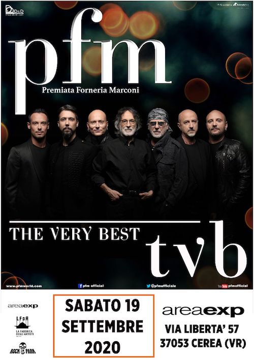 Dopo una serie di concerti spettacolari Rock In Park Agency e Legend Club Milano vogliono presentarvi un nuovo evento in collaborazione con La Fabbrica Degli Artisti ed Area Exp Cerea: la PFM, Premiata Forneria Marconi, dopo lo stop imposto dalle disposizioni ministeriali, torna con alcune date del suo “TVB – The Very Best Tour, il 19 Settembre 2020 a Cerea (VR).