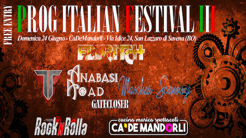 Terzo appuntamento del Prog Italian Festival, dopo il buon riscontro delle prime due edizioni, che si terrà sul palco open air del Ca de Mandorli domenica 24 giugno 2018, ad ingresso rigorosamente gratuito. Dalle 19,00 sarà possibile cenare nel ristorante situato nella location. In caso di pioggia o maltempo il Festival si terrà all’interno del locale, nella sala concerti.