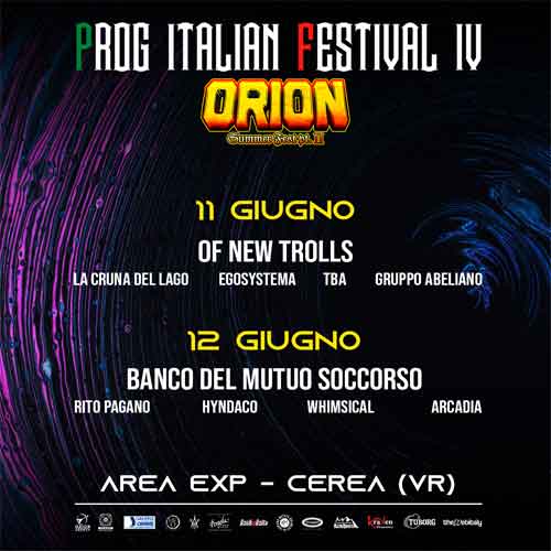 Rocknrolla Eventi ed Orion Agency sono orgogliose di presentare il ritorno del PROG ITALIAN FESTIVAL, quest’anno in versione estiva all’Area EXP di Cerea (Verona), all’interno della rassegna estiva “Orion Summer Fest”. Per questa quarta edizione sono previsti due giorni di festival e due headliner straordinari e che hanno fatto la storia del prog italiano: gli OF NEW TROLLS ed IL BANCO DEL MUTUO SOCCORSO!