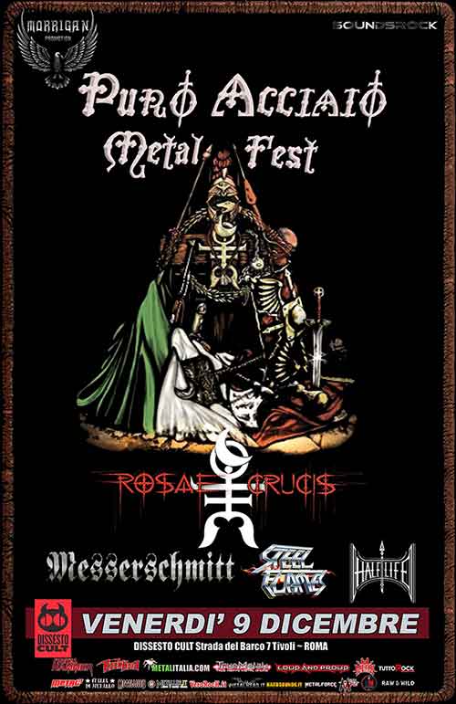 Ora è finalmente giunto il turno gli headliner della serata, gli alfieri italiani del metallo più ortodosso ed epico che tornano sul palco dopo una lunga assenza….Ladies and gentlemen….i ROSAE CRUCIS. La band si forma nel lontano 1988 per volere dei chitarristi Andrea”Kiraya” Magini ed Igor Baccei ai quali si unisce a breve Giuseppe “Ciape” Cialone alla voce. Nel corso degli anni nonostante vari cambi di line up il nucleo compositivo formato da Ciape e Magini resta inalterato potendo così sviluppare la propria identità musicale ed il proprio trademark fatto di potenza ed epicità e soprattutto reso unico dalla scelta del cantato in lingua madre che fa “ribattezzare” la band dagli addetti ai lavori come i “Manowar italiani”. La formazione ormai consolidata da diversi anni vede alla seconda chitarra Tiziano Marcozzi e la tellurica sezione ritmica composta da Daniele Cerqua al basso e Piero Arioni alle pelli. La band negli anni ha prodotto 4 demo, 5 cinque album ed un Ep tutti ottimamente accolti dalla stampa e sopratutto dai fan che l’hanno resa una band di culto tra gli amanti del metal più puro ed incontaminato tra echi di band come Manowar, Cirith Ungol e Manila Road ed un gusto melodico tutto italiano, insomma puro acciaio! La band ha tenuto centinaia di concerti e calcato i palchi dei più prestigiosi club e Festival Open Air dividendo il palco con band del calibro di Grave Digger, Hammerfall, Riot, Ross The Boss, Manilla Road, Rage ecc. ed ora è tornata più agguerrita che mai!