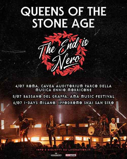 I Queens Of The Stone Age annunciano due nuovi appuntamenti in Italia per l’estate 2024 e sarà quindi protagonista giovedì 4 luglio 2024 alla Cavea Auditorium Parco Della Musica Ennio Morricone per il Roma Summer Fest e venerdì 5 luglio 2024 all’Ama Music Festival di Bassano Del Grappa, Villa Ca’ Cornaro, oltre alla data già annunciata di sabato 6 luglio 2024 all’I-Days Milano 2024.