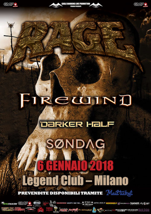 È tutto confermato per l’unica data italiana dei RAGE, programmata per il 6 Gennaio 2018, presso il Legend Club di Milano. Come precedentemente annunciato, saranno accompagnati dai FIREWIND di Gus-G (Ozzy Osbourne) e dagli australiani DARKER HALF, per la prima volta in Europa. A far gli onori di casa saranno invece gli emiliani SØNDAG che per l’occasione presenteranno il loro nuovo album “Stick To The Plan” , il secondo full length della band la cui uscita è prevista per il prossimo 29 Dicembre via Manifest Records.