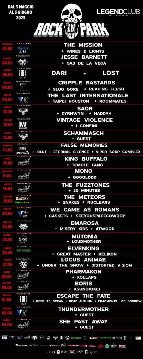 Ad aprile ecco che arriva come di consuetudine l’annuncio del Rock in Park Festival, rassegna musicale arrivata alla sua quattordicesima edizione, che inaugura ufficialmente da anni la stagione estiva al Legend Club Milano.Gli eventi in programmazione dal 3 maggio al 3 giugno vedranno tantissimi artisti e band dai generi più disparati.