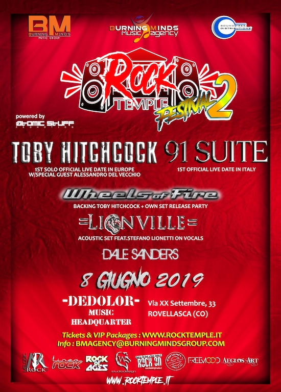Rock Temple, il mail order internazionale dedicato a tutti fan della musica rock e metal, in collaborazione con Burning Minds Music Group e Burning Minds Music Agency, è orgoglioso di annunciare la seconda edizione del “Rock Temple Festival”! Dopo la prima notevole edizione del 2018, che ha visto gli storici AORster canadesi Boulevard suonare in Italia per la prima volta nella storia, lo staff dell’evento ha lavorato senza sosta per offrire un’altra serata da ricordare a tutti i supporter della grande scena rock melodica. L’evento si terrà al Dedolor Music Headquarter di Rovellasca (CO). Per la prima volta in Italia in qualità di artista solista, Toby Hitchcock sarà l’headliner dell’edizione 2019 con una stupefacente setlist, composta da brani inclusi nei propri lavori solisti, più alcune acclamate hit estratte dagli album di Pride Of Lions e Survivor. Toby sarà accompagnato in questa serata speciale da una band di alto profilo come i Wheels Of Fire, con in aggiunta due ulteriori cantanti ai cori: Marcello Spera (Alchemy) e Maryan. Ma le sorprese non sono finite, perché il maestro delle tastiere Alessandro Del Vecchio si unirà alla band sul palco per completare una line-up di massimo livello. Co-headliner di questa meravigliosa serata saranno gli storici 91 Suite, una delle più popolari melodic rock band provenienti dalla Spagna. Dopo due album di culto di pura estrazione AOR rilasciati nei primi 2000, il gruppo si è recentemente riunito in formazione originale per iniziare i lavori su quello che sarà il terzo studio album ufficiale. Per la prima volta assoluta in Italia, la band presenterà le proprie brillanti composizioni per dar vita ad un concerto che promette di rimanere per sempre nei ricordi di tutti gli appassionati fan della scena rock melodica. Già al servizio di sua maestà Toby Hitchcock in questa serata speciale, i rispettati Wheels Of Fire avranno inoltre a disposizione uno slot personale per festeggiare l’uscita del loro terzo atteso studio album “Begin Again” (mixato e masterizzato dal guru della console Roberto Priori, e in arrivo a Giugno su Art Of Melody Music). Alcuni dei nuovi brani saranno presentati dal vivo per la prima volta in assoluto. Gli alfieri dell’AOR tricolore Lionville non hanno bisogno di alcuna introduzione all’interno dell’audience internazionale del genere, vista l’alta qualità compositiva e tecnica sciorinata nei tre album in studio sin qui rilasciati. Il mastermind Stefano Lionetti si sobbarcherà l’onere delle parti vocali in uno speciale set acustico, offrendo al pubblico della serata un entusiasmante viaggio con episodi estratti all’interno di tutta la discografia a firma Lionville. Ad aprire le danze di questo atteso evento troveremo invece Dale Sanders, pronto a regalare alcuni estratti dal suo debut album “Handle With Care”, pubblicato recentemente tramite Freemood Promotions. Prodotto da un nome garanzia di qualità come quello di Mario Percudani, l’album vede inoltre la partecipazione dei rinomati membri degli Hungryheart Josh Zighetti, Stefano Scola e Paolo Botteschi (oltre ovviamente al già citato Mario Percudani) .
