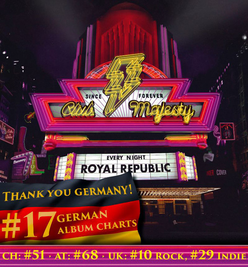 Congratulazioni! Il sensazionale quartetto rock svedese ROYAL REPUBLIC è entrato nella classifica degli album in Germania alla posizione numero #17 con il nuovo album, “Club Majesty”! La band è anche entrata nella classifica svizzera alla posizione numero #51, in Austria alla posizione #68 e anche nella classifica rock inglese alla posizione #10 e nella classifica indie alla posizione #29!