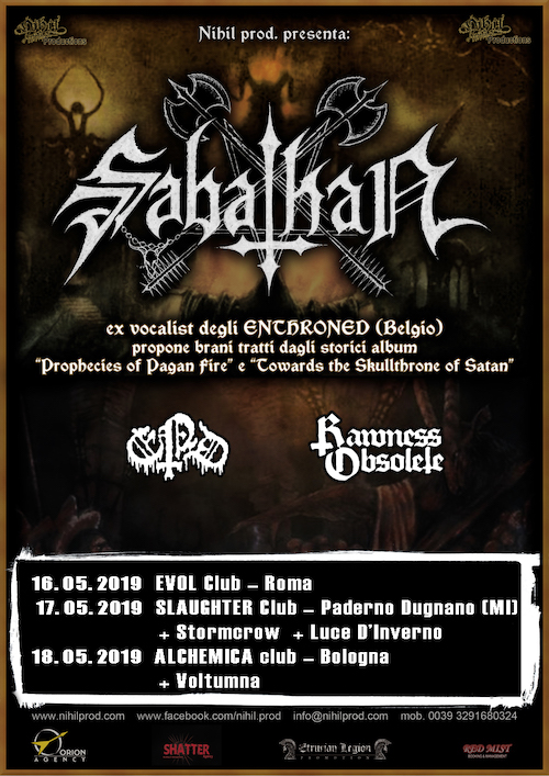 Attenzione! Di seguito vi comunichiamo i nuovi club e le band di supporto che accompagneranno il primo minitour in Italia del ex-cantante, storico, degli Enthroned che per l’occasione rispolvererà brani tratti dai primi due album della band belga ” Prophecies of Pagan Fire” e “Towards the Skullthrone of Satan”. Ad accompagnarli per tutte e tre gli appuntamenti italiani ci saranno due band ben conosciute nel panorama underground italiano gli End e i Rawness Obsolete.Vi ricordiamo inoltre che come spaceial guest a Milano suoneranno gli Stormcrow, Luce d’Inverno e a Bologna i Voltumna. 16,17,18 Maggio, tre date imperdibili per i veri cultori della Fiamma Nera!