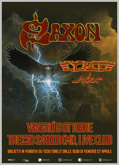 I Saxon saranno al Live Club di Trezzo Sull’Adda in provincia di Milano, il 5 ottobre prossimo. Con loro i Raven e Y&T per completare questo tour che inizierà il 19 settembre da Bruxelles in Belgio e si concluderà il 16 ottobre a Utrecht in Olanda.
