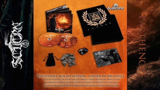 – Box limitatissimo (100 copie) contenente un doppio cd deluxe digibook (con il bonus CD della versione orchestrale dell’album), libretto a 20 pagine, un plettro targato Scuorn, una card autografata da Giulian e un sacchetto di pietre provenienti direttamente dalle sacre pendici del Vesuvio.