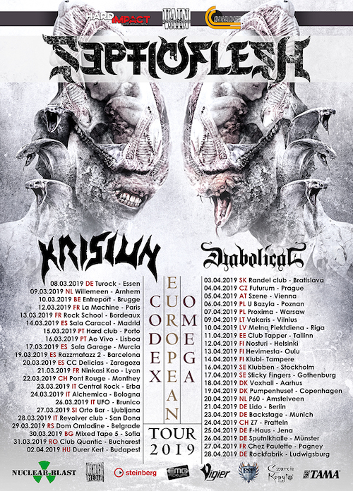 Quarantacinque concerti per il “Codex Omega European Tour” dei Septicflesh che partirà l’8 marzo 2019 da Essen in Germania. Ventidue paesi interessati, Italia compresa con quattro date a Erba (CO), Bologna, Brunico (BZ) e San Donà di Piave (VE) (rispettivamente il 23,34,26 e 28 Marzo).