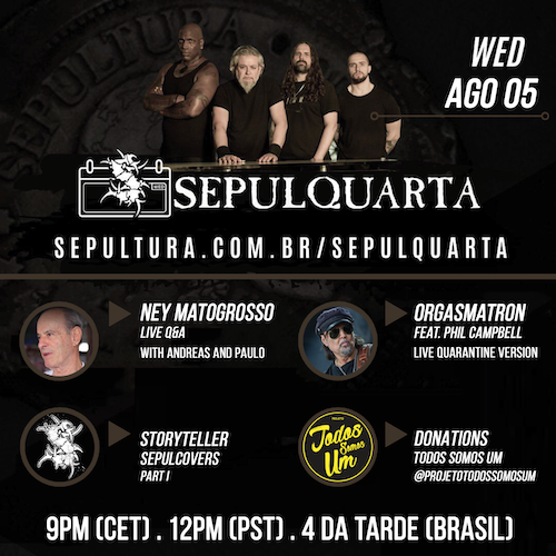 Andreas Kisser commenta «Il prossimo SepulQuarta sarà fantastico. Sono davvero felice di annunciare che avremo una Q&A in diretta con una leggenda vivente, lo straordinario Ney Matogrosso. Uno dei pionieri del rock in Brasile con la sua band Secos & Molhados, è la voce più riconoscibile della musica brasiliana e ne siamo onorati! Inoltre, avremo un’altra leggenda vivente a jammare con noi: il nostro maestro e fratello Phil Campbell dei grandi Motörhead! Offriremo una bella e storica performance di “Orgasmatron”! Non perdetelo!»