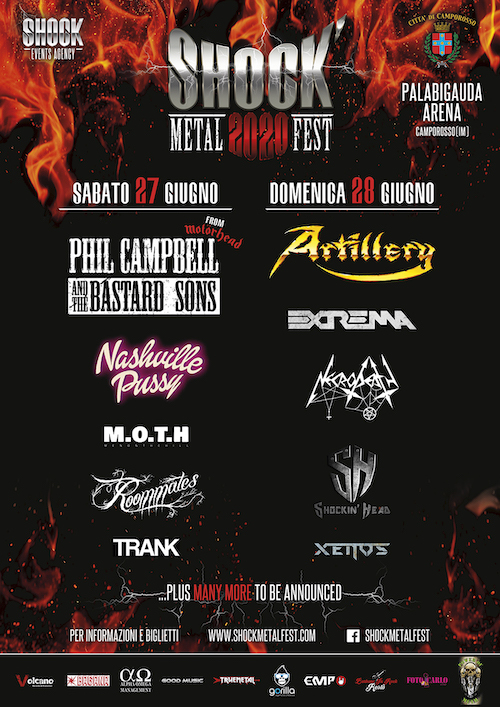 Dopo il successo dell’edizione 2019 che aveva visto headliner i Rhapsody Of Fire, torna il festival rock-metal più caldo del ponente ligure! Organizzato da Shock Events Agency e con la collaborazione promozionale di Volcano Records & Promotion, va in scena sabato 27 e domenica 28 giugno lo Shock Metal Fest 2020 che quest’anno vedrà una carrellata di ben 14 band internazionali tutte concentrate sul main stage del Palabigauda Arena di Camporosso, Imperia. Si preannunciano due giorni di fuoco e fiamme che vedranno sabato il leggendario chitarrista dei Motorhead, Phil Campbell and the Bastards Sons, gli americani Nashville Pussy, gli italiani Roomates e due formazioni francesi, i M.o.t.h. ed i Trank; la domenica sarà dedicata al metal con le leggende danesi Artillery, i mitici Extrema e Necrodeath e due formazioni giovani ma di grandi speranze, Shockin’ Head e Xenos. A completare il bill dei due concerti, ci saranno le band selezionate da un contest che partirà in primavera. I biglietti per i concerti possono essere acquistati sul sito di Shock Events Agency come giornata singola (sabato 30 euro e domenica 25) o abbonamento per tutto il fest (50 euro) e comprenderanno la possibilità di accedere all’area camping mentre l’area ristoro esterna all’arena sarà liberamente accessibile anche senza biglietto per vivere l’atmosfera di un grande evento hard’n’heavy!