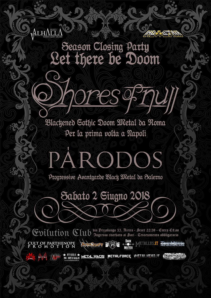 Prima di spostarsi in esterna per la stagione estiva, Valhalla Agency e Indastria Eventi sono orgogliose di produrre quello che è il primo live della band capitolina in quel di Napoli. Forti di una già vasta esperienza internazionale e di due meravigliosi album (“Quiescence”, Candlelight Records – 2014; “Black Drapes for Tomorrow”, Spinefarm Records – 2017), gli SHORES OF NULL saranno i protagonisti del Closing Party dell’Evilution Club con il loro Blackened Gothic Doom.