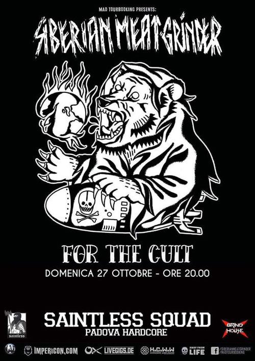 Primo extra date della stagione per Saintless a ottobre… Una bella bombetta che ci farà finire il week end bene ed iniziare alla grandissima la settimana. Ci vengono infatti a trovare dalla Siberia con furore i SIBERIAN MEAT GRINDER, i paladini del Crossover Hardcore/Metal con una affiliazione particolare allo Street style! Due album all’attivo ed una quantità infinita di live assieme ad Agnostic Front, Terror e moltissime altre leggende.