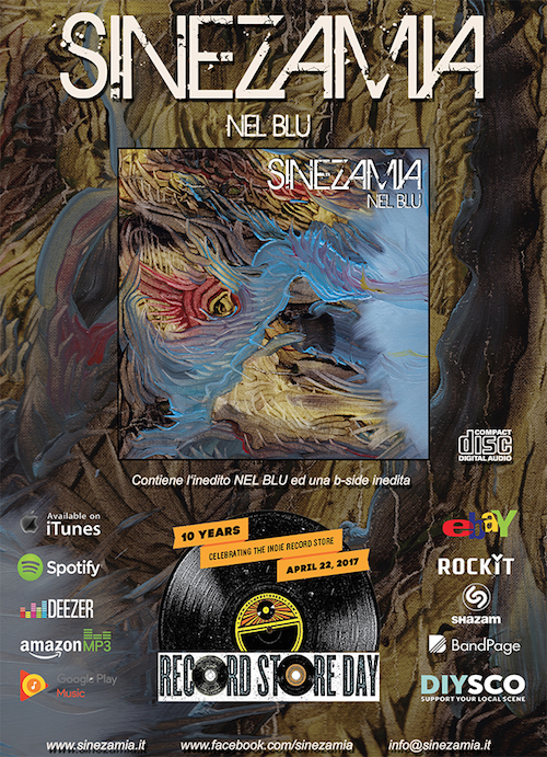 “Nel blu” è il nuovo singolo dei mantovani Sinezamia, in uscita il 22 Aprile in occasione del #Recordstoreday2017; lavoro che esce a distanza di due anni dal live “Decadanza” e che anticipa l’uscita nel nuovo album, su cui la band sta ultimando la pre-produzione.