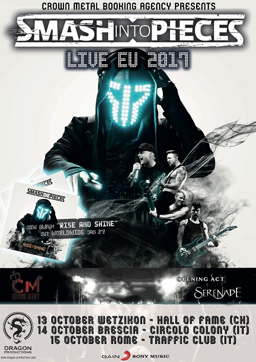 Tornano in italia per due date i Smash Into Pieces la band svedese lo scorso 27 Gennaio ha pubblicato il nuovo album “Rise And Shine” dopo essere stata in tour con gli Amaranthe la band torna a farci visita questa volta come headliner, la prima data in Italia sarà il 14 Ottobre a Brescia al Circolo Colony, il 15 Ottobre a Roma al Traffic Club esordio assoluto per la band nella Capitale, il 13 ottobre la band suonerà in Svizzera a Wetzikon all’Hall of Fame show che sarà sempre curato dalla Crown Metal.