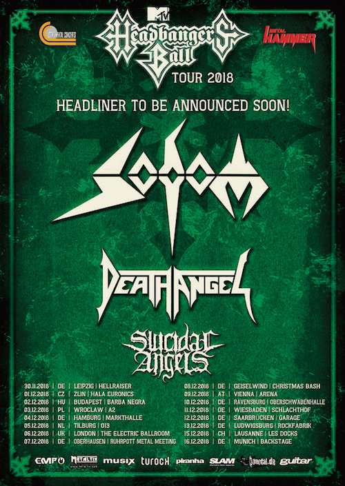 I DEATH ANGEL commentano: “Stiamo tornando per voi! Siamo davvero felici di annunciare la nostra partecipazione all’MTV Headbangers Ball Tour 2018. SODOM, DEATH ANGEL e SUICIDAL ANGELS vi faranno visita. Ci vediamo a novembre e dicembre!”.