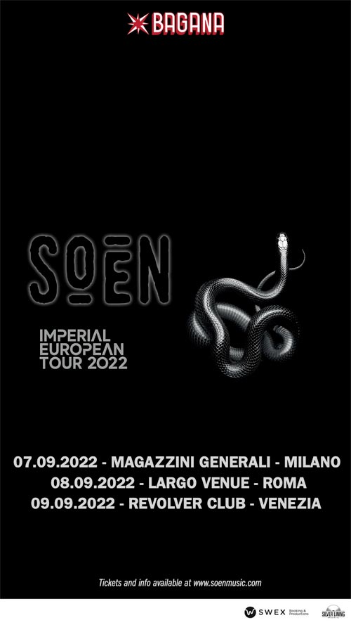 Si riconferma anche il terzo appuntamento in Italia per l’imponente formazione svedese SOEN, che sarà dal vivo questo settembre con l’ultimo album “IMPERIAL” uscito a gennaio 2021 per Silver Lining Music (recensione qui).