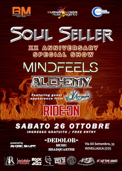 Burning Minds Music Agency, in collaborazione con Rock Temple, il mailorder internazionale dedicato a tutti i fan della musica rock/metal, Sound Trek Distributions & Burning Minds Music Group, è orgogliosa di annunciare un nuovo speciale evento dal vivo dedicato ai melodic rocker Italiani Soul Seller, nato per celebrare il ventesimo anniversario dalla loro fondazione. Grazie alla nuova line-up, che vede l’ingresso di Dale Sanders alla chitarra, Alex Rimoldi alle tastiere e Stefania Sarre al basso, i Soul Seller tornano a calcare un palco di un accattivante evento, con quello che promette di essere un meraviglioso show di hard-rock melodico. Questo concerto nasce con la volontà di celebrare i 20 anni di musica della band piemontese, con due album ufficiali rilasciati sul mercato, a cui si uniscono numerose collaborazioni da parte degli elementi della band con alcuni dei più rispettati artisti della scena rock melodica. La sestlist della serata sarà composta da brani tratti da “Back To Life” e “Matter Of Faith”, cui si affiancheranno un paio di succose anteprime incluse nel loro terzo atteso studio album. I Mindfeels, già autori del brillante “XXenty” (rilasciato nel 2017 tramite Art Of Melody Music), condivideranno il palco con i propri amici piemontesi Soul Seller, con l’obiettivo di festeggiare tale importante ricorrenza grazie al loro Westcoast AOR di classe. Dopo il successo ottenuto dal vivo nella terza edizione della “A Melodic Rock Night”, gli Alchemy presenteranno ancora una volta dal vivo alcune delle migliori tracce tratte dal loro nuovo album “Dyadic”, rilasciato lo scorso mese di Marzo tramite Street Symphonies Records. Ospite speciale dell’evento sarà la nuova sensazione dell’AOR al femminile, Maryan, che salirà sul pacco accompagnata dagli Alchemy con l’obiettivo di proporre il proprio singolo di debutto “Like A Dragonfly”, più un nuovo brano in esclusiva tratto dal proprio prossimo debut album, schedulato per l’uscita su Art Of Melody Music. L’onere di aprire questo importante concerto dal vivo spetta ai Ride-On, nuova promettente rock band da Torino con due album autoprodotti, guidata dall’esperto frontman dei Soul Seller, Eric Concas.