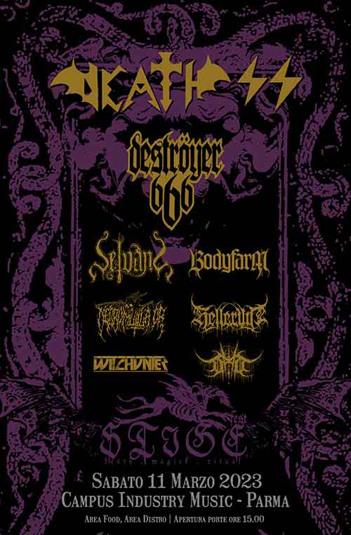 Torna l’11 marzo il festival dedicato alla musica estrema e occulta. Il primo festival in Italia ad aver portato nelle scorse edizioni band come Blasphemy, Revenge, Tormentor, One Tail One Head e molti altri. Lo-Fi Creatures Events annuncia il bill completo dello Stige Fest 2023, il quale si svolgerà al Campus Industry Music di Parma, e vedrà protagonisti i Death SS, storica band italiana attiva fin dal 1977, in compagnia di Deströyer 666, Selvans, Bodyfarm, Necromutilator, Helleruin e infine anche gli italiani Witchunter e Devoid Of Thought.