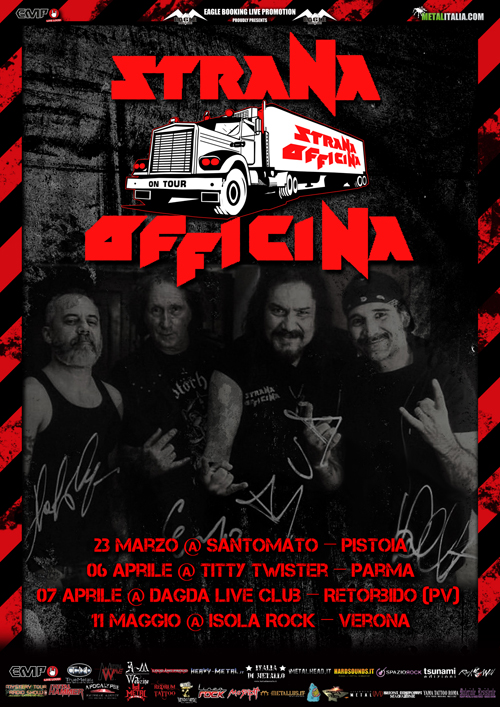 Si avvicinano le date della STRANA OFFICINA previste per il prossimo week end. La band calcherà il palco del Titty Twister di Parma Venerdi 6 Aprile, e quello del Dagda Club di Retorbido (PV) Sabato 7 Aprile.