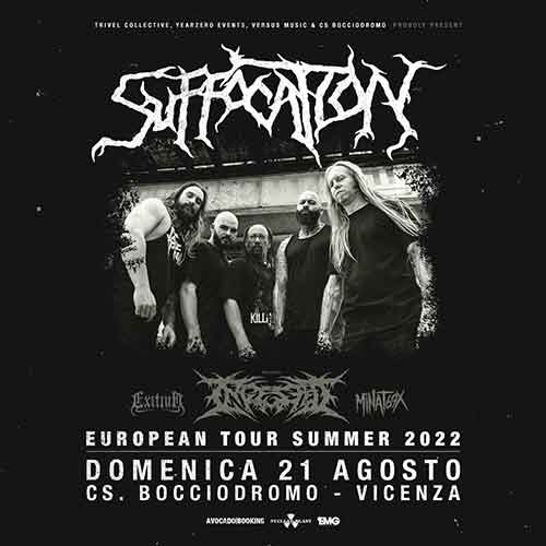 Trivel Collective, Avocado Booking, Year Zero Events, Orion Agency & Versus Music Project, presenteranno domenica 21 agosto sul palco del csBocciodromo di Vicenza, una tappa del tour estivo dei Suffocation.