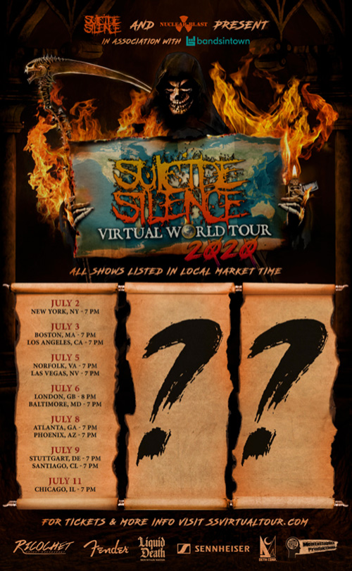 I SUICIDE SILENCE saranno “virtualmente” ovunque nel mese di Luglio con 39 date del “Virtual World Tour” dal 2 al 30 Luglio che abbracceranno 14 paesi e 5 continenti. Ogni streaming geolocalizzato durerà approssimativamente un’ora e mezza e includerà una performance dal vivo registrata professionalmente in multi-camera con l’aggiunta di una chat completa, media mixati personalizzati per ogni mercato e un lungo Q&A dopo la performance. Le date iniziali sono ora in vendita alla seguente location per 10$ ognuna e sono disponibili solo a coloro che si trovano nel raggio di quella zona specifica.