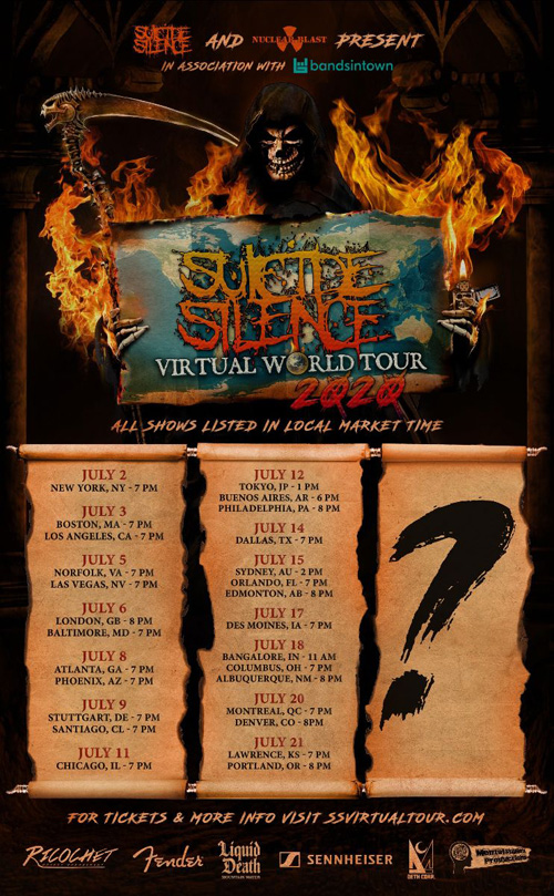 I SUICIDE SILENCE saranno “virtualmente” ovunque nel mese di Luglio con 39 date del “Virtual World Tour” dal 2 al 30 Luglio che abbracceranno 14 paesi e 5 continenti. Ogni streaming geolocalizzato durerà approssimativamente un’ora e mezza e includerà una performance dal vivo registrata professionalmente in multi-camera con l’aggiunta di una chat completa, media mixati personalizzati per ogni mercato e un lungo Q&A dopo la performance.