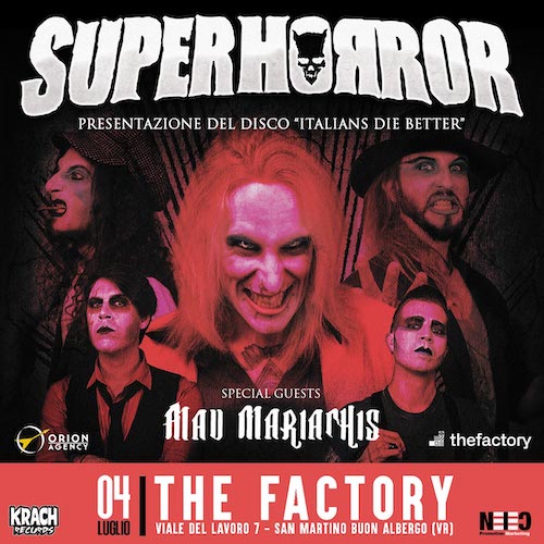 Inoltre, i SUPERHORROR sono lieti di annunciare il loro ritorno sul palco fissato per sabato 4 luglio 2020 al THE FACTORY di San Martino Buon Albergo (VR) insieme alla band punk hardcore Mad Mariachis.