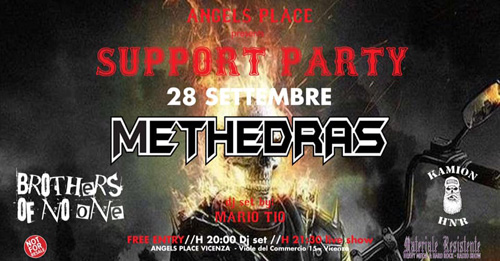 Sabato 28 settembre a Vicenza presso il Angels Place (Hells Angels MC) serata metal che vedrà sul palco i lombardi Methedras reduci da uno show in supporto agli Slayer. I Methedras saranno accompagnati dai vicentini Brothers Of No One e dai Kamion Band, heavy ‘n’ roll band veneta.