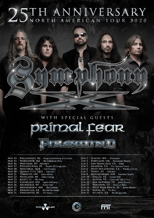 I maestri del progressive metal del New Jersey SYMPHONY X sono felici di annunciare il “25th Anniversary North American tour 2020”! Le ventotto date inizieranno a Englewood, NJ il 14 maggio per concludersi il 17 giugno al The Masquerade di Atlanta. Ospiti speciali del tour saranno i compagni di etichetta PRIMAL FEAR, attualmente impegnati nelle registrazioni del nuovo album, e i FIREWIND!I SYMPHONY X commentano: “Siamo davvero entusiasti di festeggiare questa pietra miliare della nostra carriera! I concerti in Europa e Sud America sono stati incredibili l’anno scorso e non vediamo l’ora di suonare per i nostri fan americani! Siamo davvero contenti di avere con noi in questo tour PRIMAL FEAR e FIREWIND per celebrare venticinque anni di un vero viaggio musicale! Siamo impazienti per il futuro, che porterà anche più musica per tutti coloro che sono stati con noi tutto questo tempo. Ci vediamo nel 2002!”.