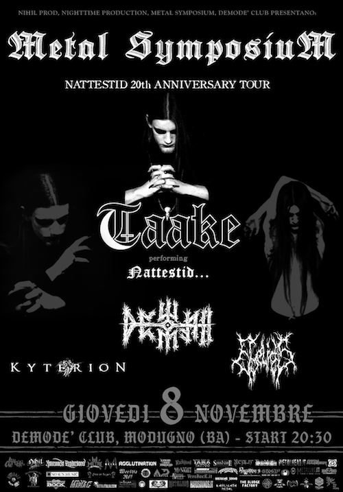 Giovedì 8 novembre i Taake saranno a Bari per esibirsi sul palco del Demodè Club. I norvegesi celebreranno il ventennale del primo full length “Nattestid Ser Porten Vid” assieme a Dewfall, Kyterion e Eyelids.