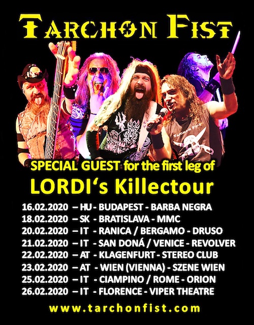 Quattro i concerti che i Tarchon Fist terranno con i Lordi, durante il mese di febbraio e dunque nella calata italiana dei secondi per il “Killectour”. Tarchon Fist, insieme a Flesh Roxon, spalleggeranno i Lordi per i seguenti concerti: