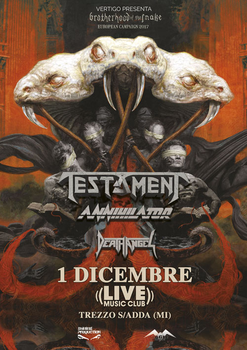 Dopo la trionfale esibizione tenuta in occasione del Metalitalia.com Festival 2015, tornano al Live Music Club Di Trezzo Sull’Adda i TESTAMENT! La band di Chuck Billy e soci è attualmente impegnata nel tour a supporto di “Brotherhood Of The Snake”, album accolto calorosamente dai fan di tutto il modo, che ancora una volta conferma l’ottimo stato di salute della band e la consegna nuovamente all’Olimpo dei “big” del thrash metal.