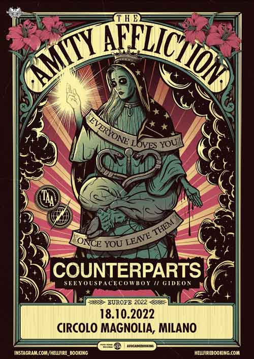 Dopo un’attesa fin troppo lunga dai palchi italiani, Hellfire Booking Agency, in collaborazione con Erocks Production, annuncia lo schiacciante ritorno degli Amity Affliction, accompagnati da Counterparts, Gideon e SeeYouSpaceCowboy!