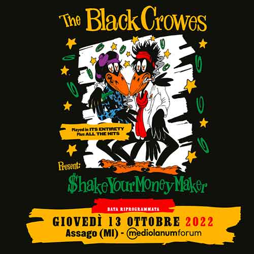 Siamo davvero spiacenti di comunicare che a causa del protrarsi su scala mondiale di problematiche e limitazioni connesse alla diffusione del virus Covid-19, l’unica data italiana del tour dei Black Crowes dedicato al trentennale di Shake Your Money Maker prevista inizialmente nel 2020 e poi spostata a sabato 6 novembre 2021 è riprogrammata per giovedì 13 ottobre 2022, sempre presso il Mediolanum Forum di Assago (MI).