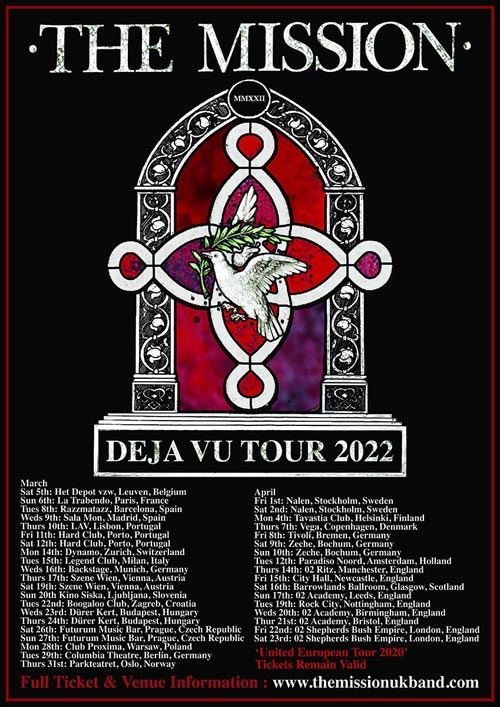 Wayne Hussey ha commentato: “Ora che la maggior parte di noi inizia a soffrire di claustrofobia – c’è un numero massimo di serie Netflix che una persona può sopportare – penso che l’anno prossimo tutti saranno ansiosi di uscire di casa per riunirsi in una grande sala insieme a persone che la pensino allo stesso modo per guardare e ascoltare un gruppo di ragazzi vicini alla pensione che fanno un gran fracasso. Detto in altri termini, le persone avranno voglia di venire a vedere i The Mission suonare le canzoni che conoscono e amano, per ballare e cantare. ‘You are a tower of strength’ suonerà ancora più potente. Non so voi, ma io non vedo l’ora.”